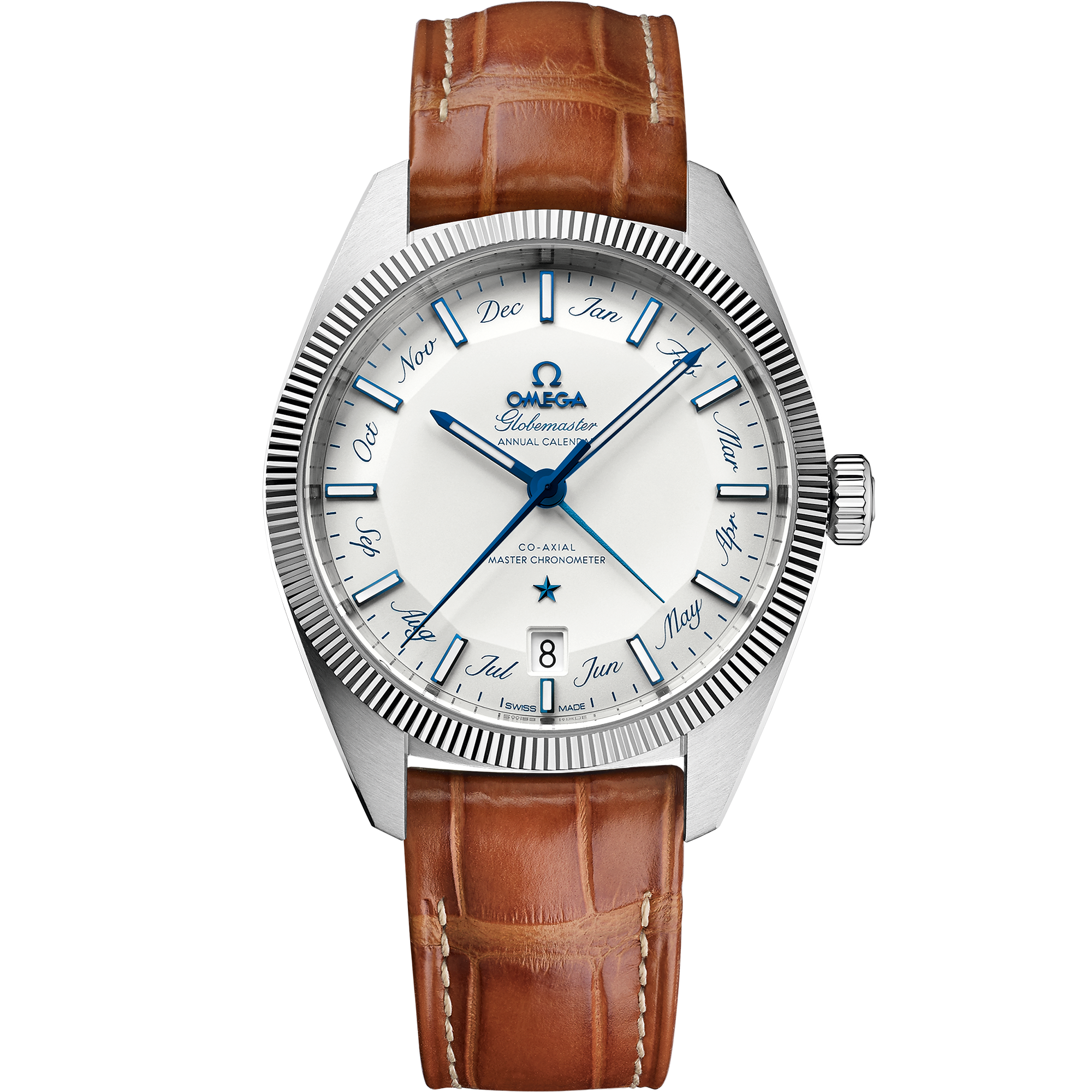 The Globemaster is already a legendary name in the OMEGA family. Now it has been updated to become the world's first Master Chronometerfurther enhancing its reputation within the watchmaking industry. For this 41.00 mm modelthe stainless steel case features a polished fluted 18K Sedna™ gold bezel. The caseback includes a Central Observatory medallion set in scratch-resistant sapphire crystal. The sun-brushed grey "Pie Pan" dial is reminiscent of the first 1952 Constellation model. Each of its facets includes a month of the year in keeping with the Annual Calendar function. There is an 18K Sedna™ gold Constellation star and OMEGA logoand 18K Sedna™ gold hands and indexes which have been filled with Super-LumiNova. This watch has a brown leather strap and is driven by OMEGA's Co-Axial Master Chronometer Annual Calendar Calibre 8922featuring revolutionary anti-magnetic technology.