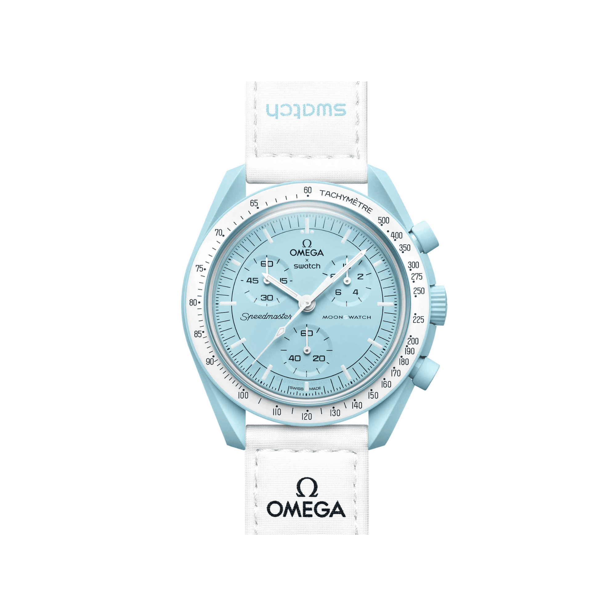 This collection combines innovative bioceramic material with iconic chronograph design elements, featuring an asymmetrical case, a classic tachymeter bezel detail, and a distinctive subdial layout.