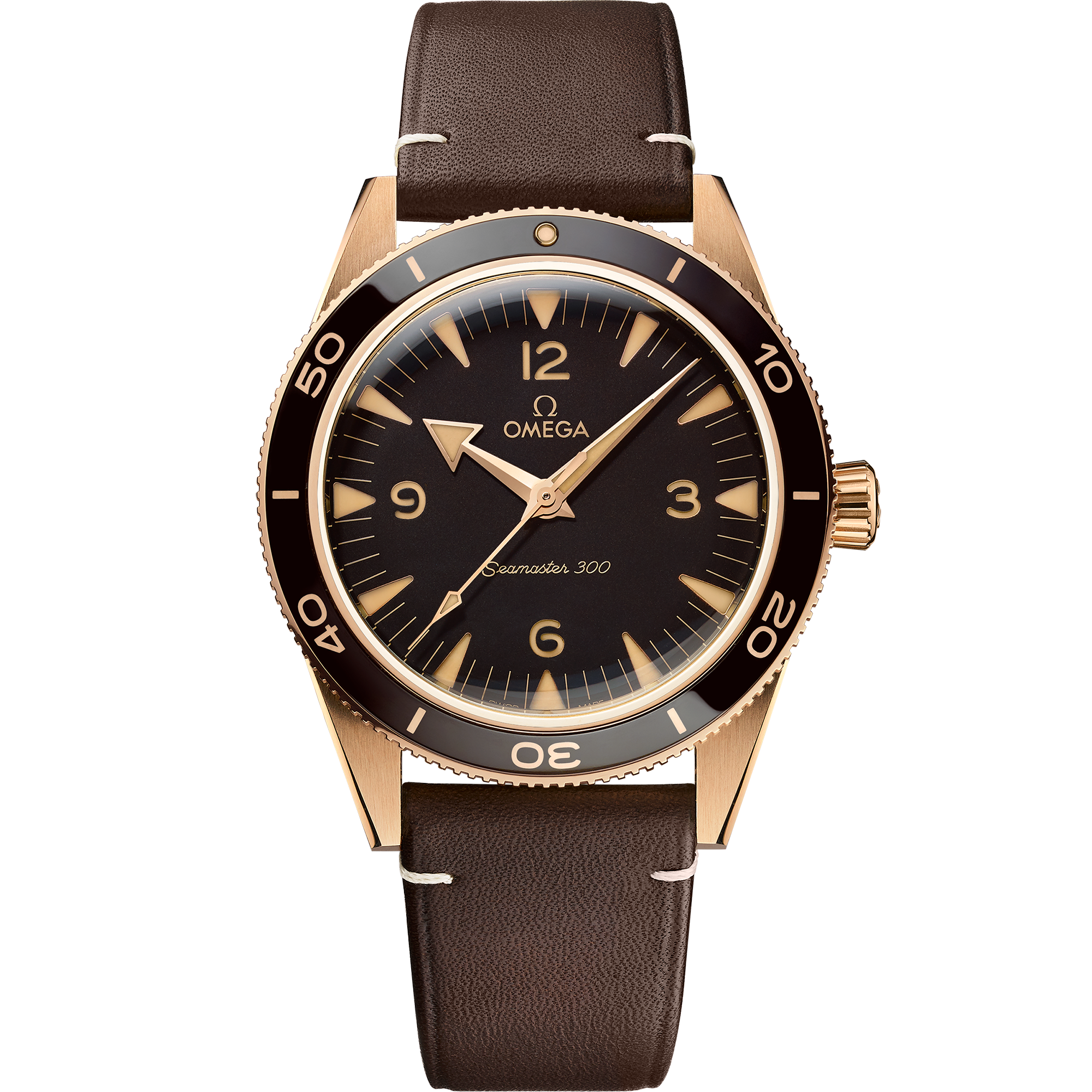 OMEGA first introduced the Seamaster 300 in 1957 - designed especially for divers and professionals who worked underwater. More than 60 years laterthe collection has been completely upgradedand includes this special model created in OMEGA’s own bronze alloy. The 41 mm case and bezel are crafted from 9K Bronze Goldwhile the brown ceramic bezel ring includes a diving scale in vintage Super-LumiNova. On the bronze dialyou’ll find recessed hour markers and open numerals with Super-LumiNovaas well as PVD Bronze Gold coloured hands. Presented on a brown leather strap with a 9K Bronze Gold bucklethis timepiece includes a transparent sapphire crystal casebackenabling a clear view of the OMEGA Co-Axial Master Chronometer Calibre 8912.