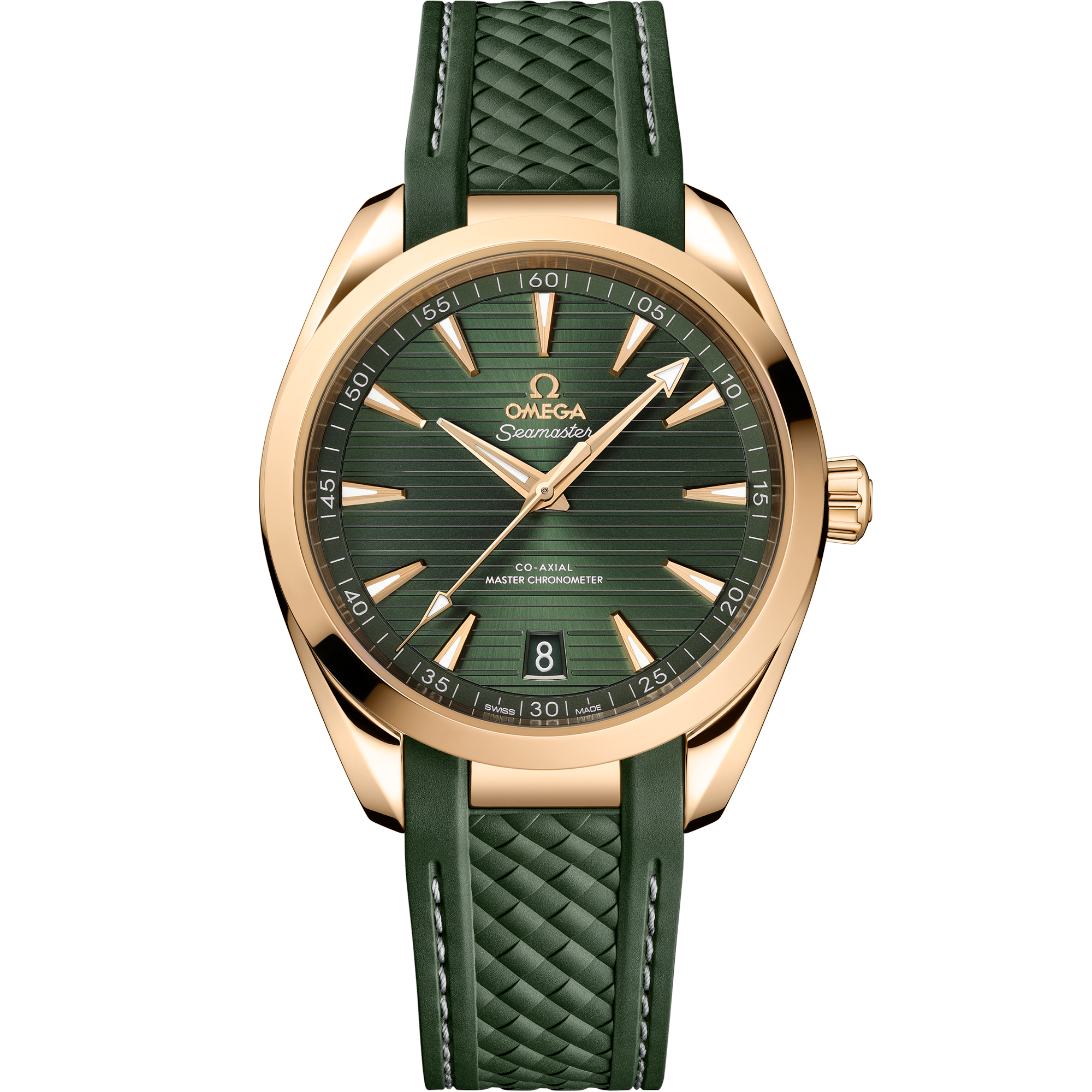 The Seamaster Aqua Terra is a superb tribute to OMEGA’s rich maritime heritage. This 41mm model has a symmetrical case crafted from 18K Moonshine™ goldwith a wave-edged design featured on the back. Its green PVD dialdistinguished by a horizontal “teak” pattern inspired by the wooden decks of luxury sailboatshas a date window at 6 o'clockand diamond-polished hands and indexes in 18K Moonshine™ goldall filled with white Super-LumiNova. The watch is presented on an integrated structured rubber strap in green with grey stitchingfixed with an 18K Moonshine™ Gold foldover clasp. Providing the power is OMEGA’s Co-Axial Master Chronometer calibre 8901certified at the industry’s highest standard by the Swiss Federal Institute of Metrology (METAS).
