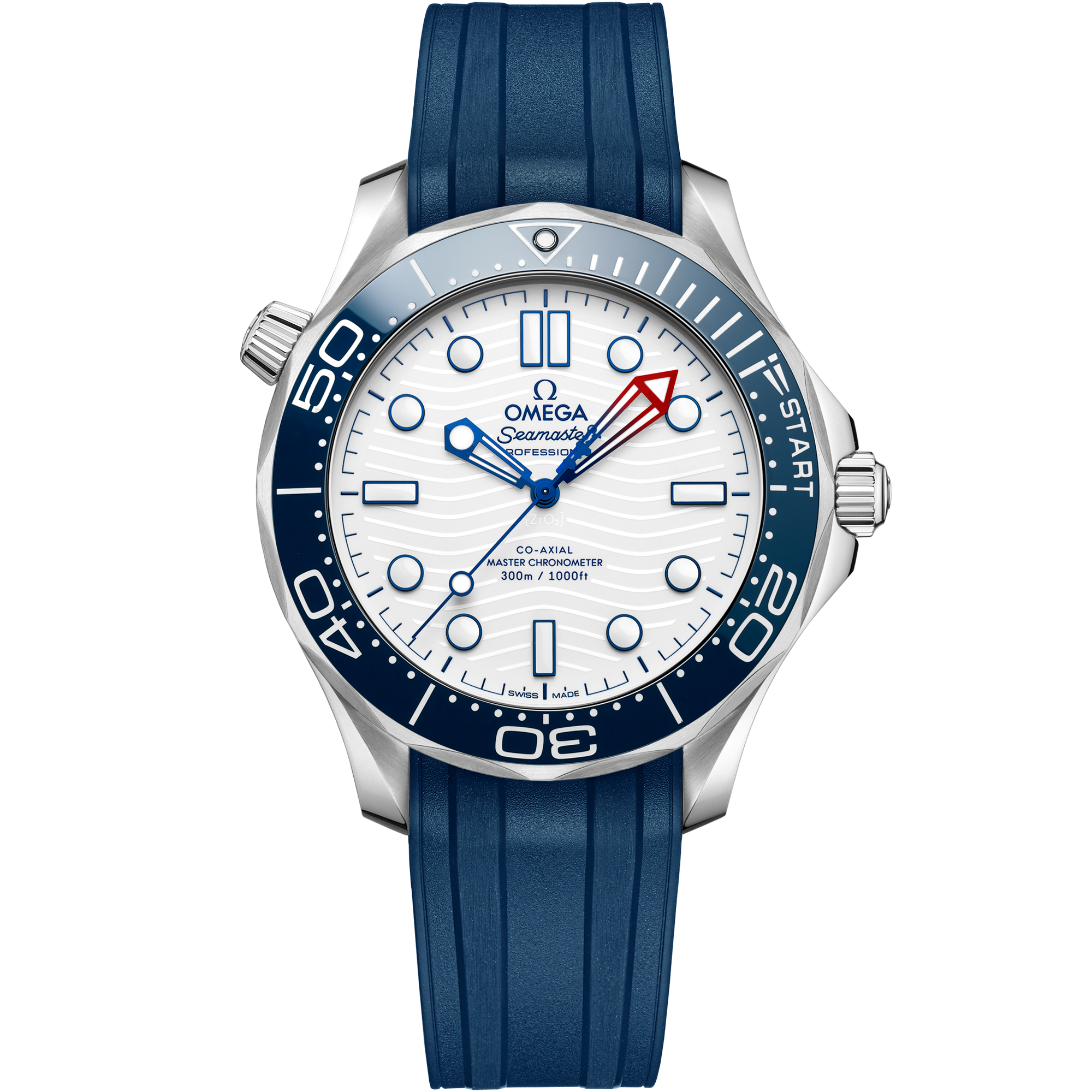 Since 1993the Seamaster Professional Diver 300M has enjoyed a legendary following. Today’s modern collection has embraced that famous ocean heritage and updated it with OMEGA’s best innovation and design. This 42 mm model is crafted from stainless steel and includes a blue ceramic bezel with a white enamel diving scale. The dial is also polished blue ceramic and features laser-engraved waves and a date window at 6 o’clock. The skeleton hands and raised indexes are rhodium-plated and are filled with white Super-LumiNovawhile the helium escape valve has been given a conical design. The watch is presented on a blue rubber strap and is driven by the OMEGA Master Chronometer Calibre 8800which can be seen through the sapphire-crystal on the wave-edged caseback.