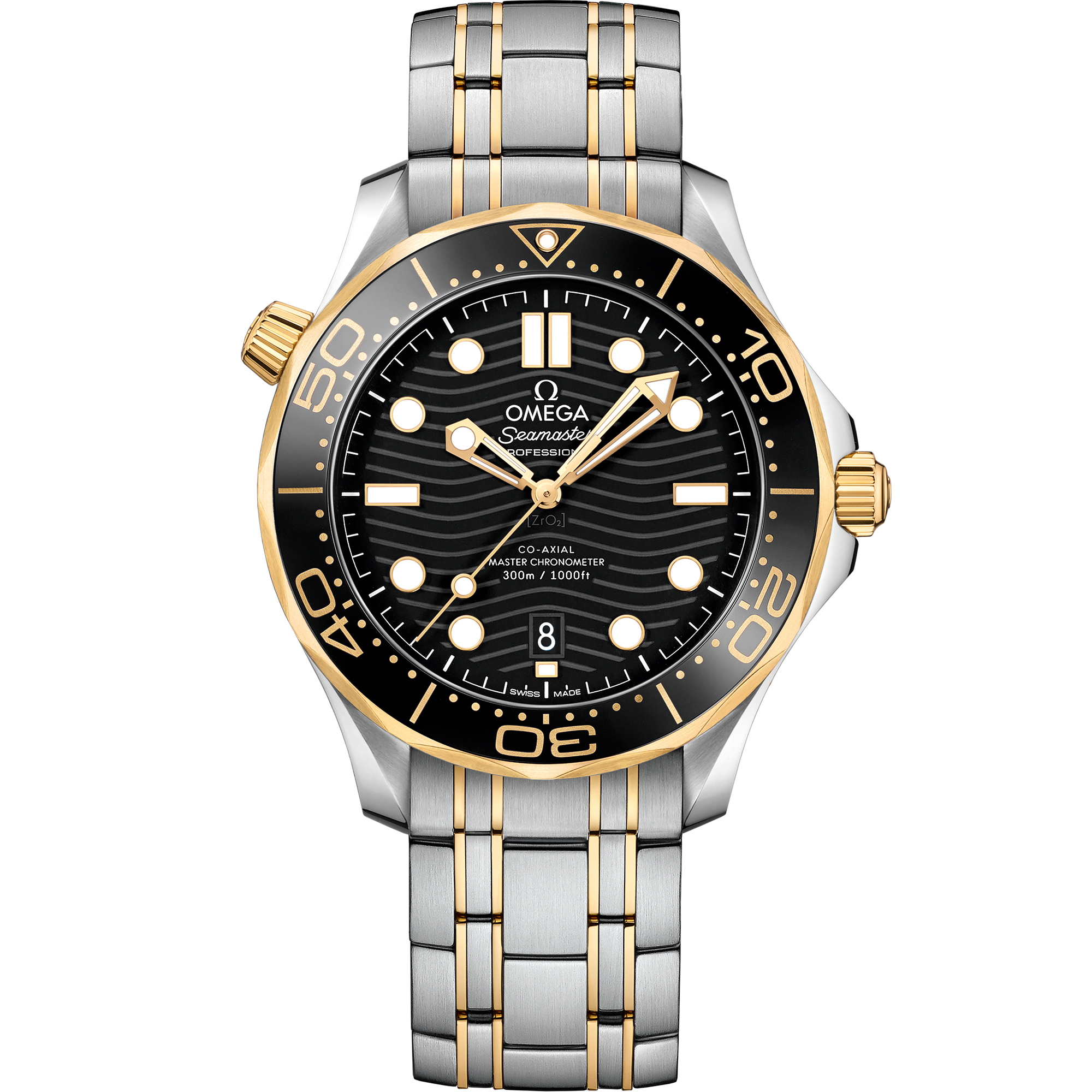 Since 1993the Seamaster Diver 300M has enjoyed a legendary following. Today’s modern collection has embraced that famous ocean heritage and updated it with OMEGA’s most advanced innovation and design. This 42 mm model is crafted in stainless steel and includes a grade 5 titanium bezel with a laser-ablated diving scale in positive relief and a single dot of white Super-LumiNova at 12 o’clock. PVD stainless steel is used to create the brushed dial as well as the polished and skeletonized hands and indexeswhich are filled with white Super-LumiNova. Other markingsincluding the OMEGA logoare transferred in black. The watch is presented on a brushed mesh bracelet with claspand is driven by the OMEGA Co-Axial Master Chronometer Calibre 8806which can be seen through the sapphire-crystal caseback.