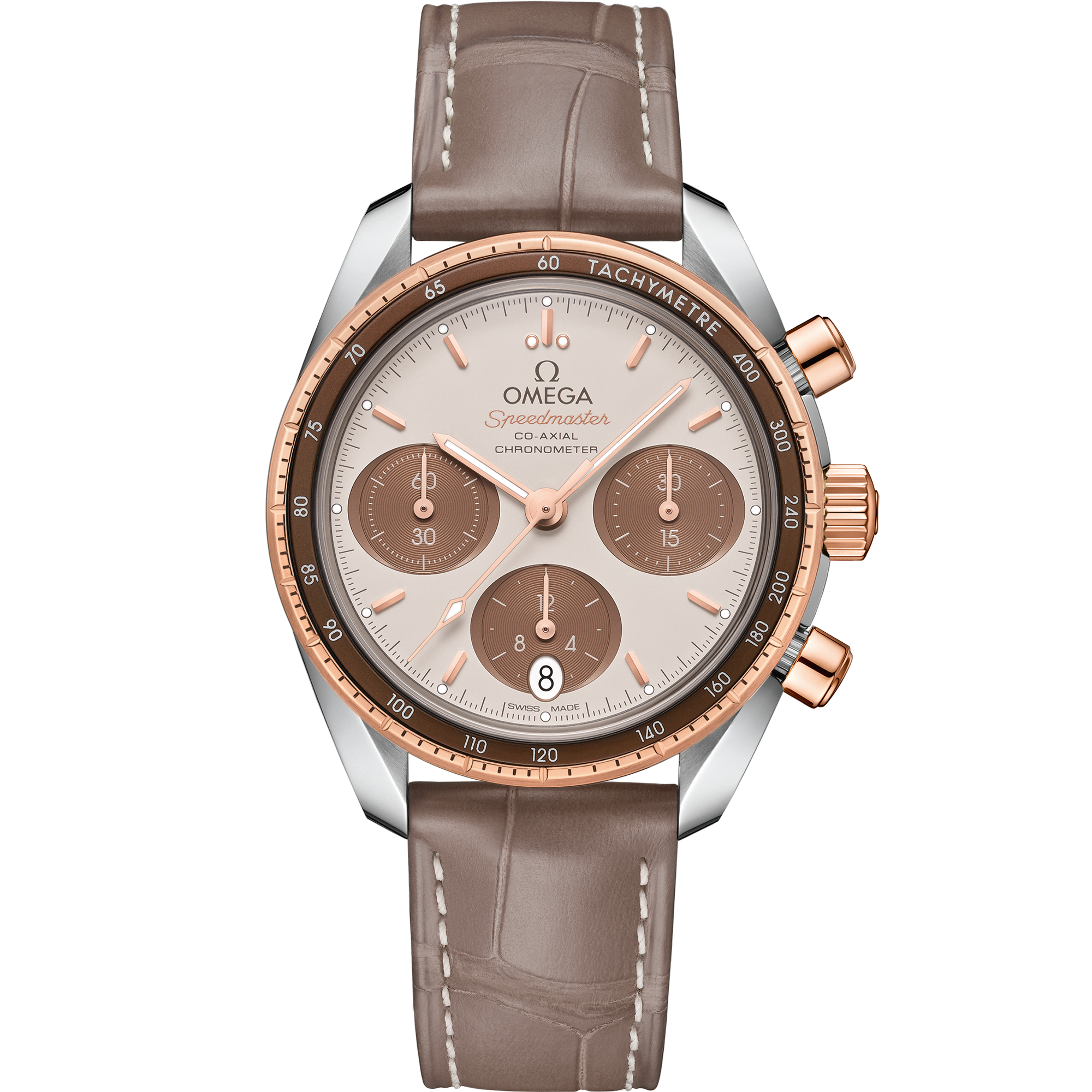 The Speedmaster 38 mm collection has been crafted with simplicitysize and colour in mindyet still retains the look and heritage of OMEGA’s most famous chronograph. This model features a stainless steel and 18K yellow gold case with a dual bezel design. The inner section of the bezel features a tachymeter scale on a green aluminium ring while the outside is diamond-paved. The opaline silvery dial includes horizontal oval subdials and a vertical oval date window at 6 o’clock. The indexes are made of 18K yellow gold while the hands are either 18K yellow gold or varnished green. The watch has a green leather strapa Seahorse medallion on the casebackand is driven by the OMEGA Co-Axial Calibre 3330.