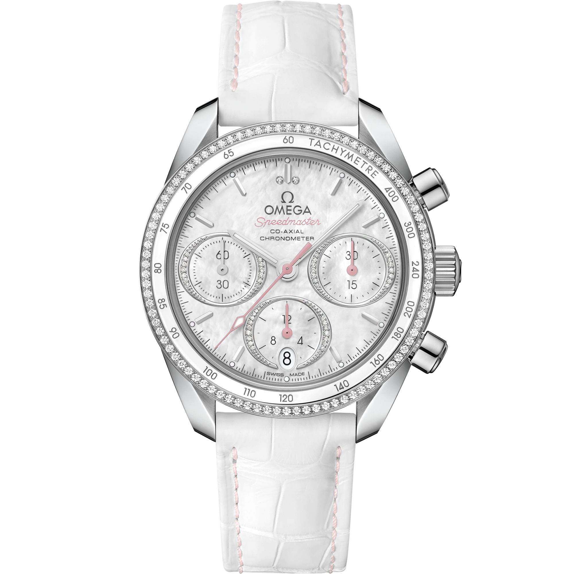 The Speedmaster 38 mm collection has been crafted with simplicitysize and colour in mindyet still retains the look and heritage of OMEGA’s most famous chronograph. This model features a stainless steel case with a dual bezel design. The inner section of the bezel features a tachymeter scale on a black aluminium ring while the outside is diamond-paved. The sun-brushed grey dial includes horizontal oval subdials and a vertical oval date window at 6 o’clock. The hands and indexes are rhodium-plated. The watch has a grey leather strapa Seahorse medallion on the casebackand is driven by the OMEGA Co-Axial Calibre 3330.