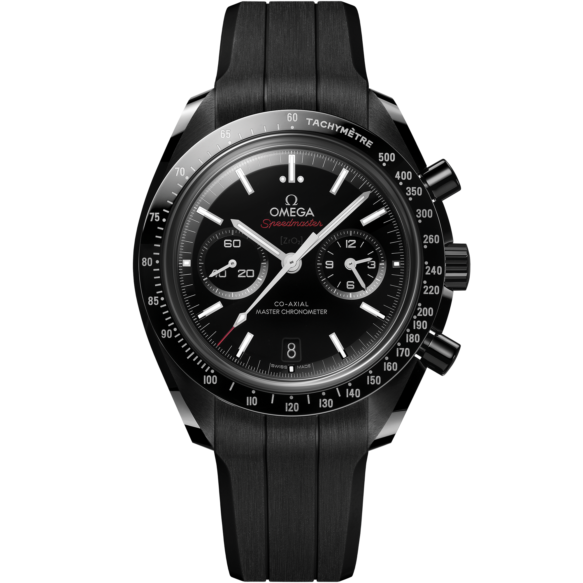 Honouring OMEGA’s legacy of space explorationthis Speedmaster Dark Side of the Moon features a 44.25 mm case in polished-brushed black ceramic. The polished bezel is also made from black ceramic and features a tachymeter scale in Liquidmetal™. Beneath the front sapphire crystalthe polished ceramic dial includes a small-seconds display at 9Ha 60-minute and 12-hour recorder at 3Hand a date window at 6H. The hour and minute handsas well as the bevelled indexes and subdial handsare all formed from 18K white gold and are filled with light green Super-LumiNova (green emission). The central chronograph hand is PVD white gold plated and reveals a red tip. Driven by OMEGA's self-winding Co-Axial Master Chronometer Calibre 9900this bold timepiece is finished with a black nylon fabric strap that includes black rubber lininga ceramic foldover claspand ceramised titanium frame-spring folders.